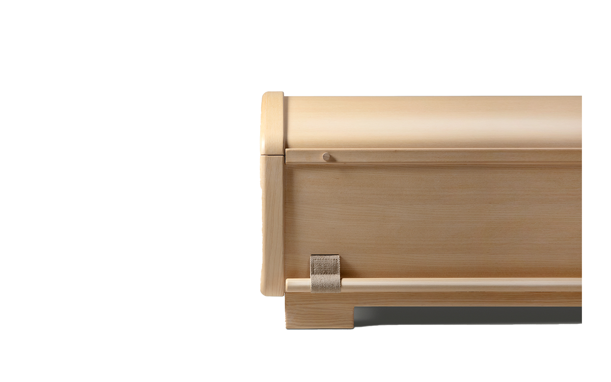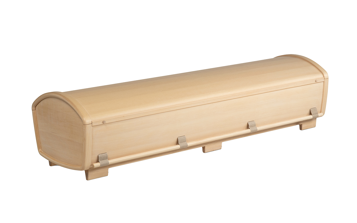 Kistan är tillverkad i oljad ask och har ett praktiskt skjutbart lock. Invändigt finner man en madrass, kudde och täcke i linnekvalitet. Den vackra bärstången i massiv ask har detaljer i rustik sadelgjord, vilket ger kistan en stilfull och naturlig känsla. Kistan är helt i trä och innehåller ingen metall, och tack vare den innovativa konstruktionen används betydligt mindre material än vid tillverkning av en traditionell kista.
